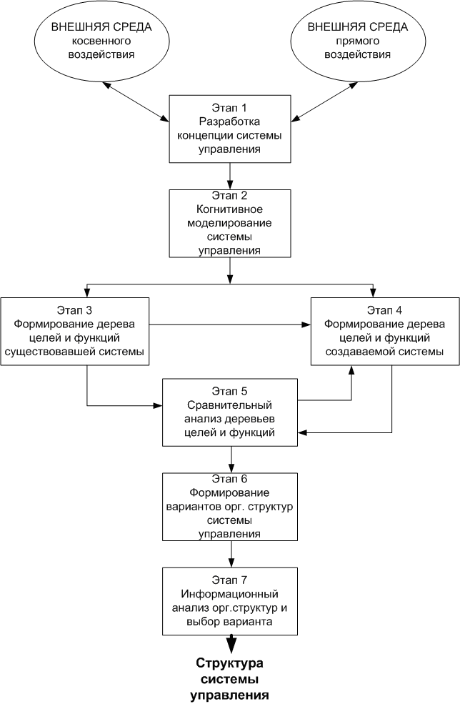 Новая структура вырастает из старой в силу того, что существовавшие системы управления уже не в состоянии решать новые задачи, инициированные изменившейся внешней средой. Поэтому на графическом изображении методики (рис. 1) этапы не следуют строго друг за другом, а информационно взаимосвязаны.